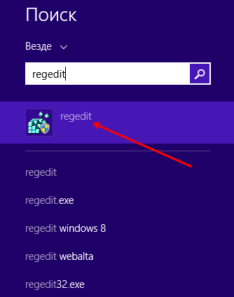Тут могут быть определенные отличия при работе с различными ОС. Например, для Windows 8 отсутствует классическое меню «Пуск». В любом случае, необходимо получить доступ к строке поиска. В неё требуется ввести regedit и запустить выданную программу.
