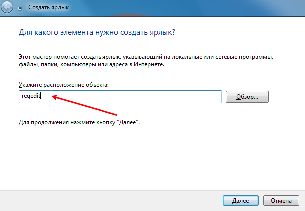 После этого откроется окно для создания ярлыков. В нем нужно ввести команду «regedit» и нажать на кнопку «Далее».